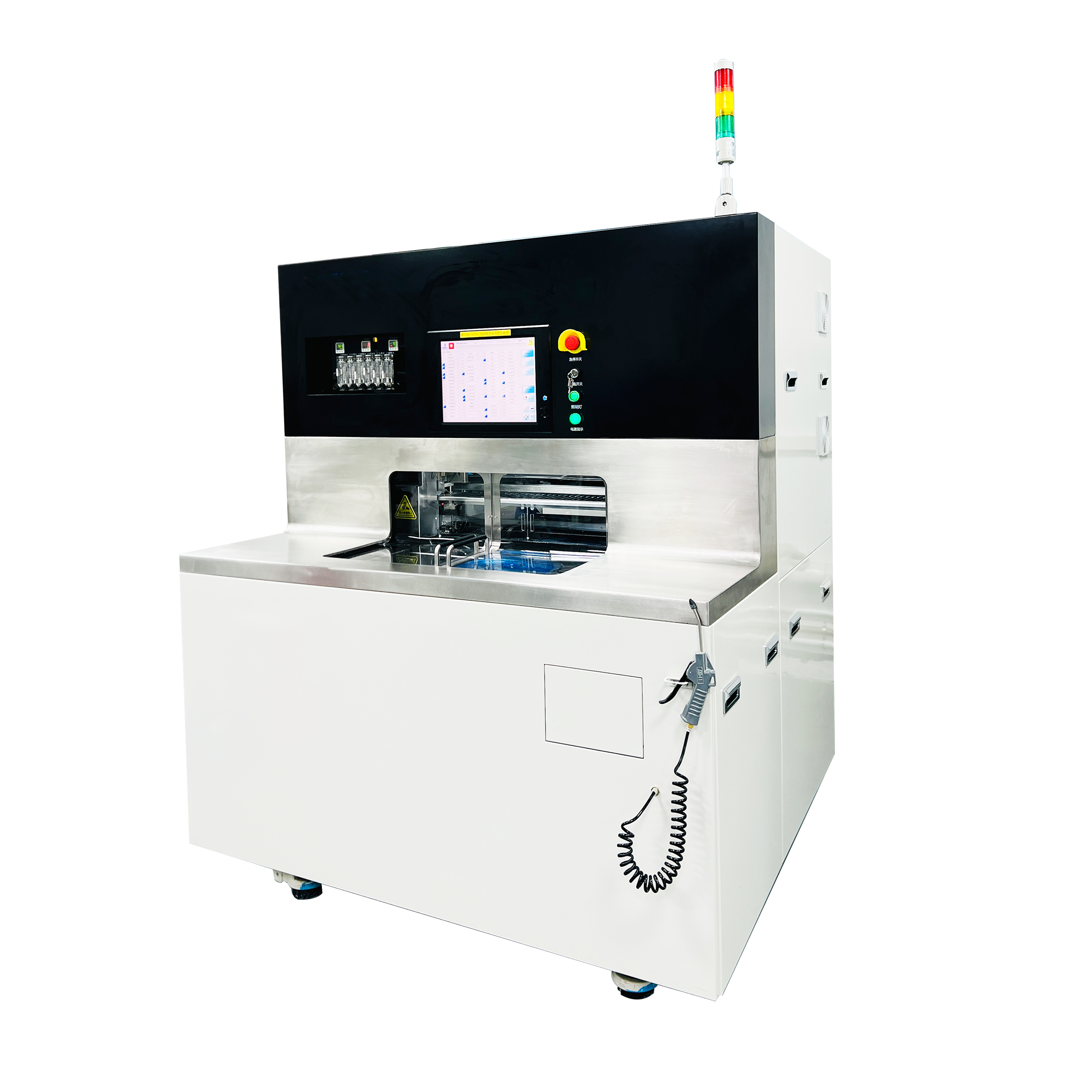 2. 上取物臂從工作盤將切割完成的材料移動(dòng)到清洗盤上,進(jìn)行二流體清洗和晶片干燥。